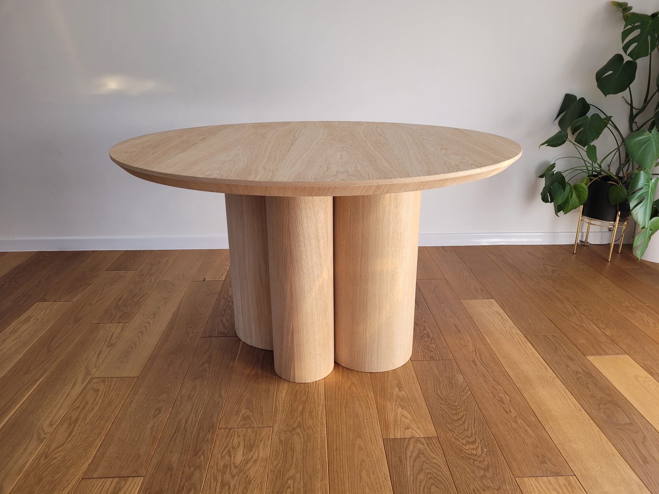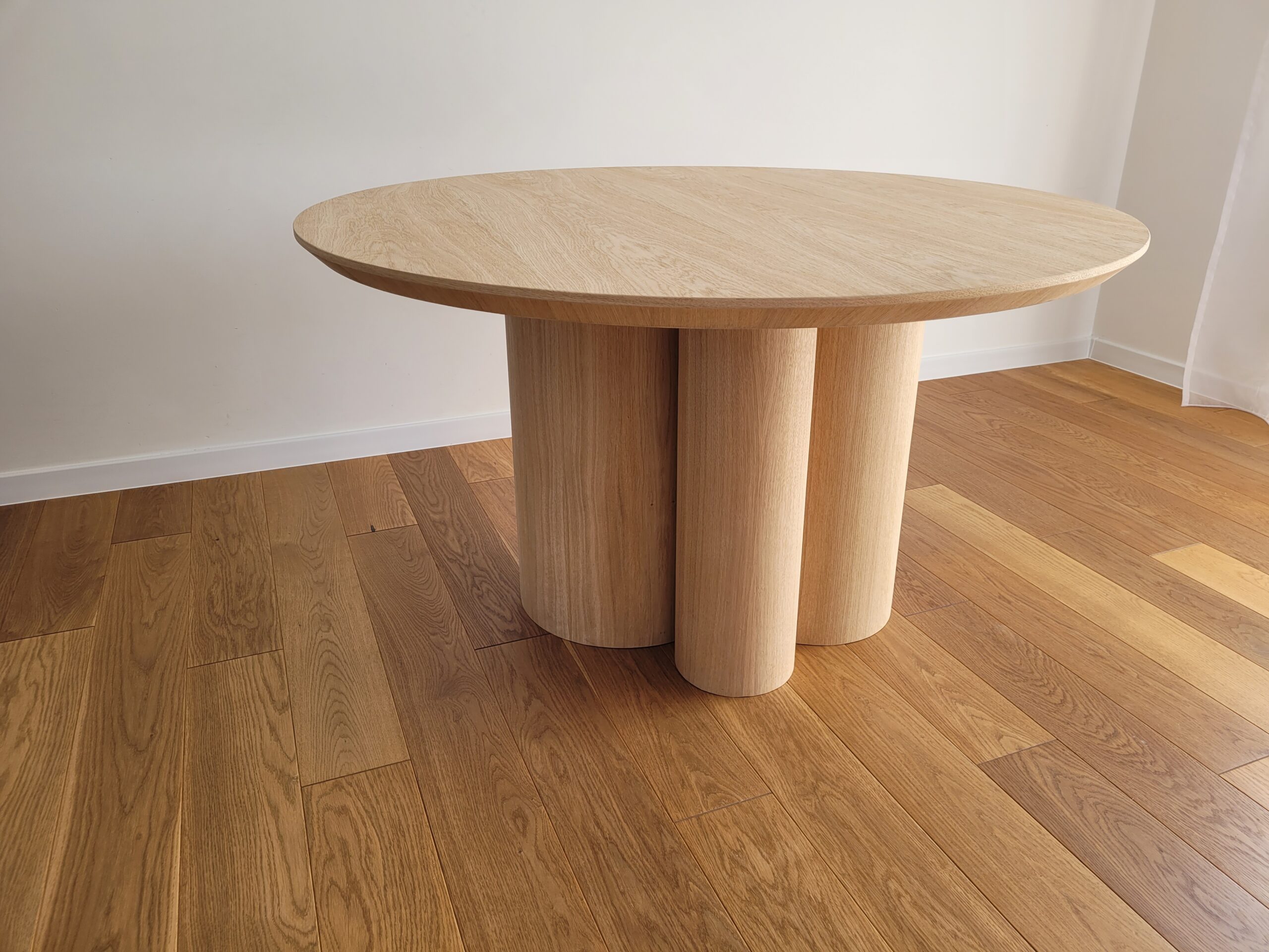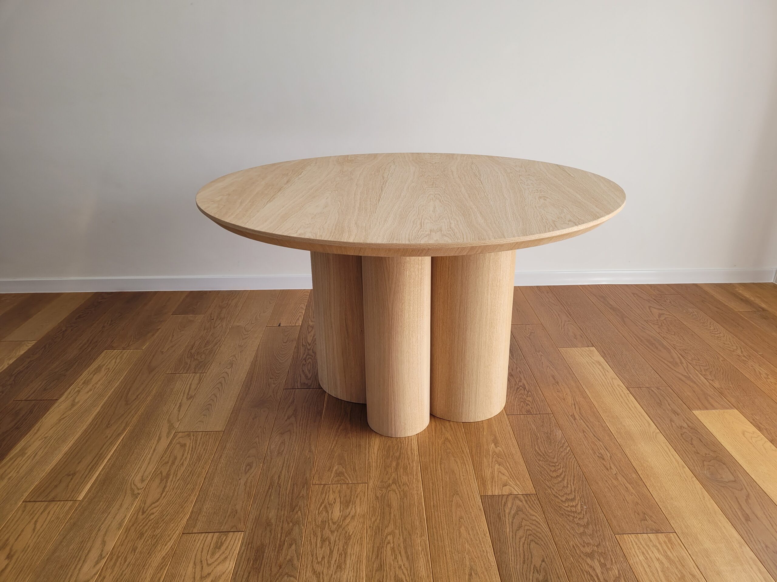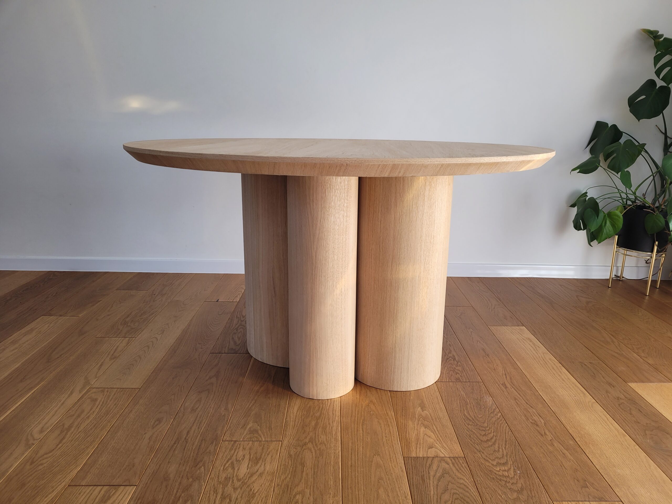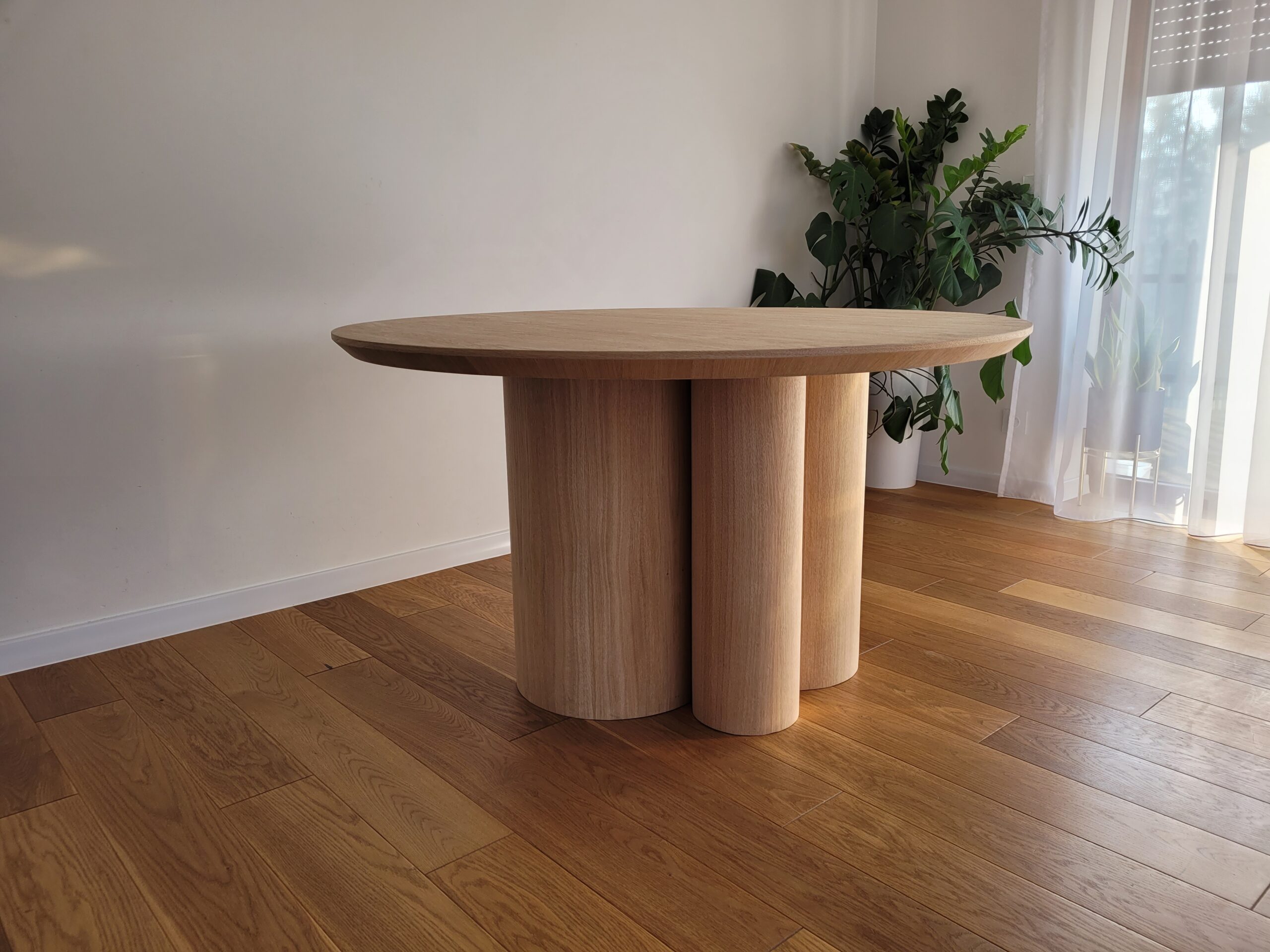 TRINITY OAK  to stół, który łączy naturalne piękno drewna z nowoczesną, architektoniczną formą. Okrągły blat wykonany z wysokiej jakości dębu osadzony jest na trzech masywnych, cylindrycznych nogach, które nadają całości wyjątkowej stabilności i charakteru.