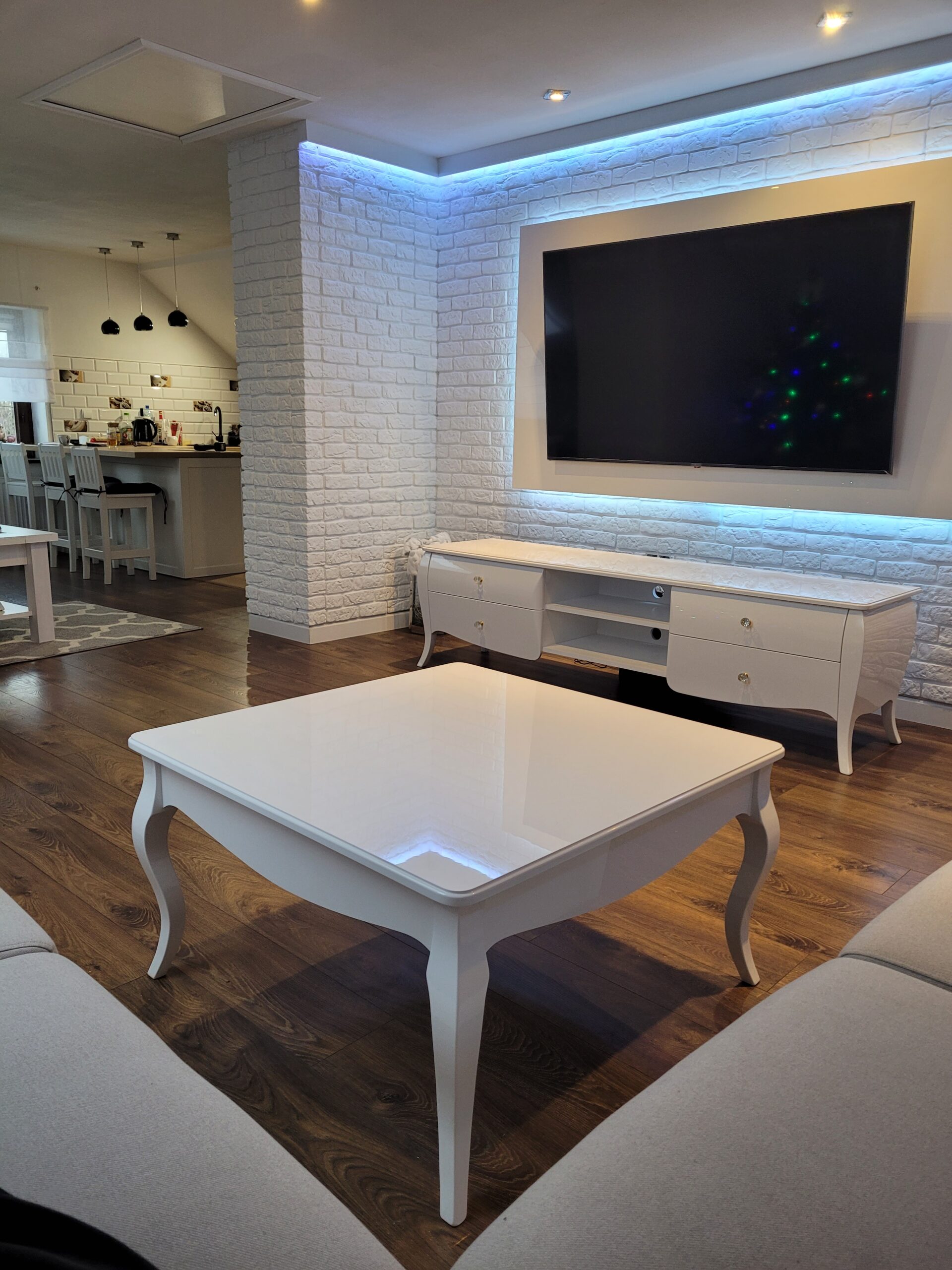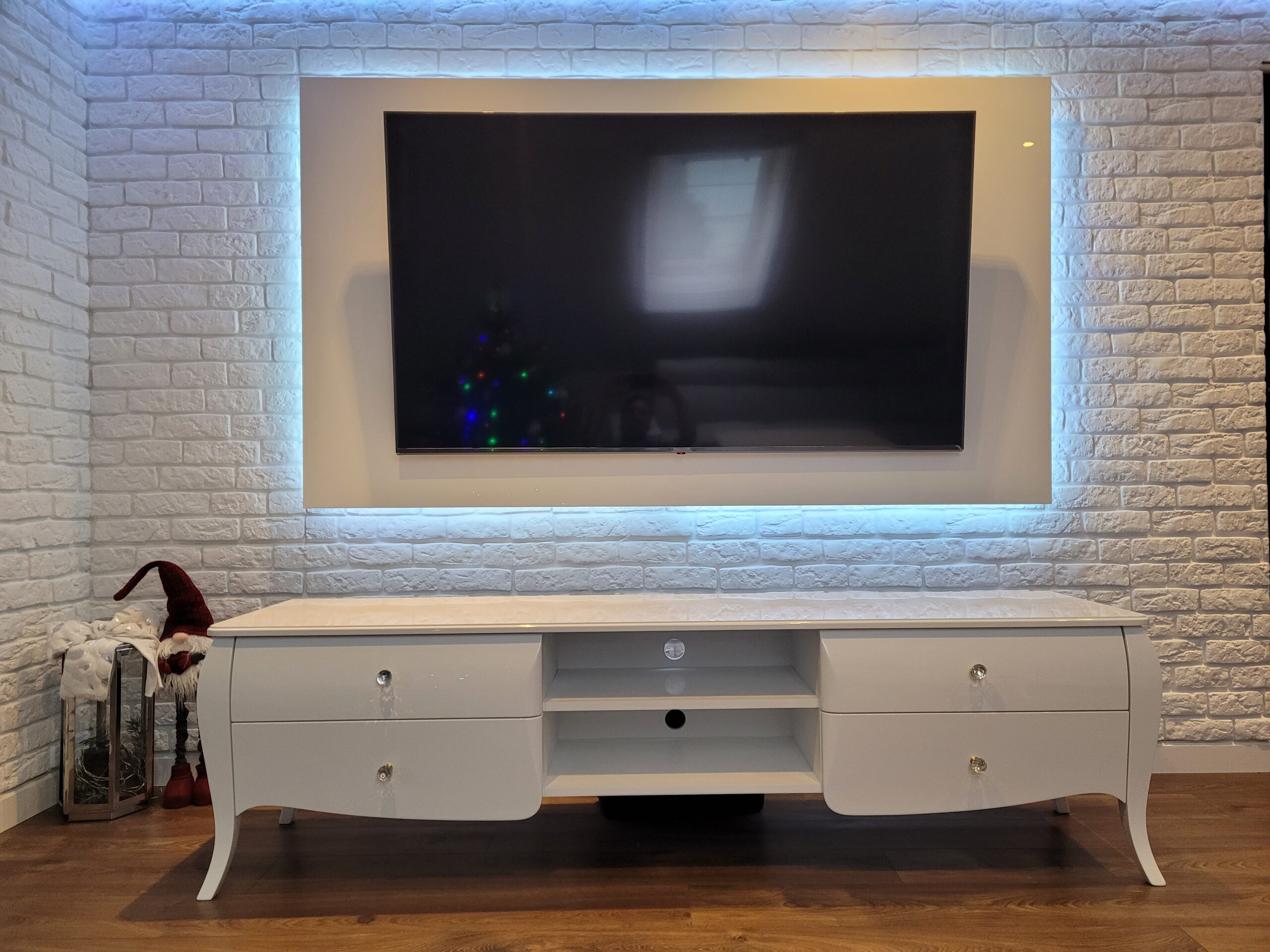 Mebel może zostać wykonany na indywidualny wymiar oraz w dowolnym kolorze, co pozwala idealnie dopasować go do wielkości telewizora, układu salonu oraz stylu aranżacji.