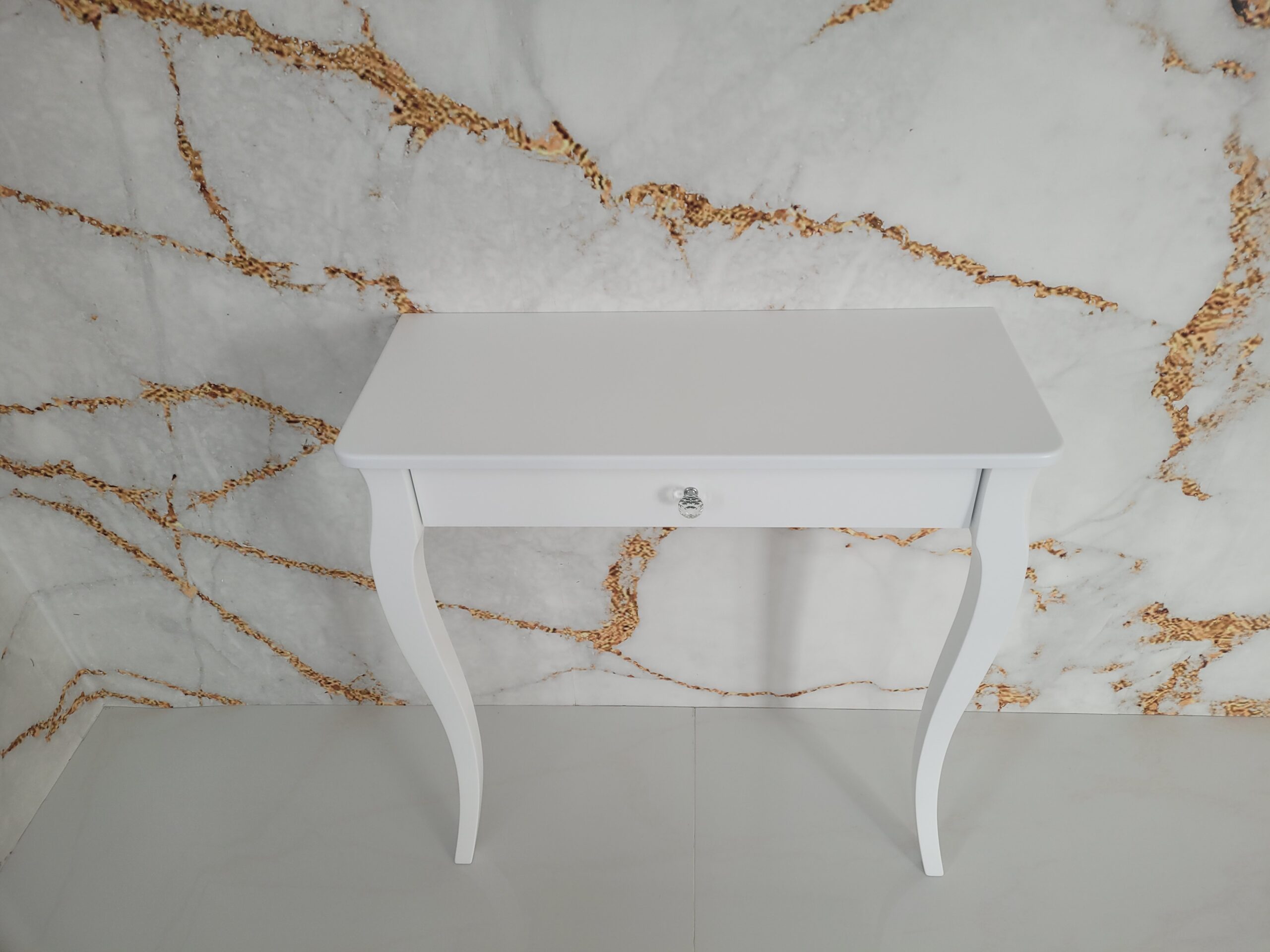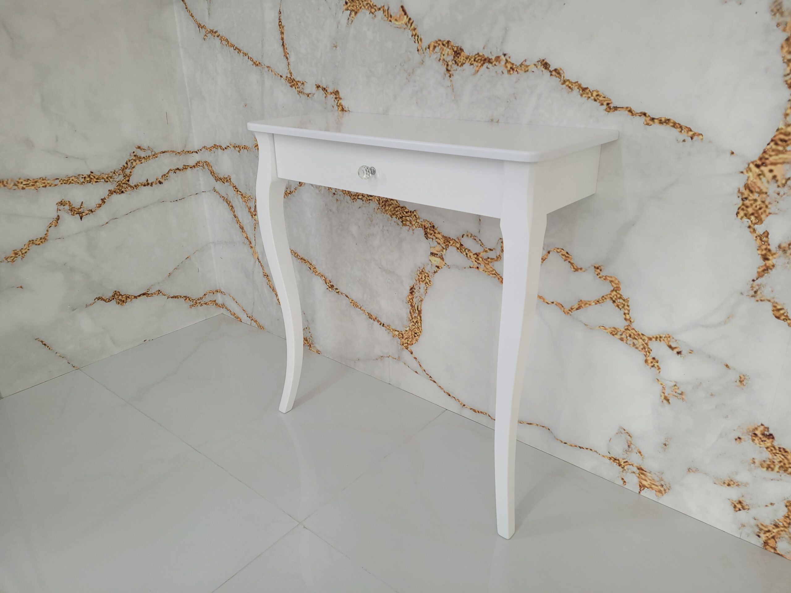 Elegancka konsola na grzejnik z jedną szufladą to funkcjonalny i stylowy mebel zaprojektowany specjalnie do zabudowy kaloryfera. Smukła konstrukcja oraz charakterystycznie gięte nogi sprawiają, że konsola prezentuje się lekko i nie przytłacza wnętrza, jednocześnie maskując grzejnik w estetyczny sposób. Wykończenie w białym kolorze nadaje jej świeżości i ponadczasowej elegancji, idealnie wpisując się w stylistykę glamour oraz Art Déco.