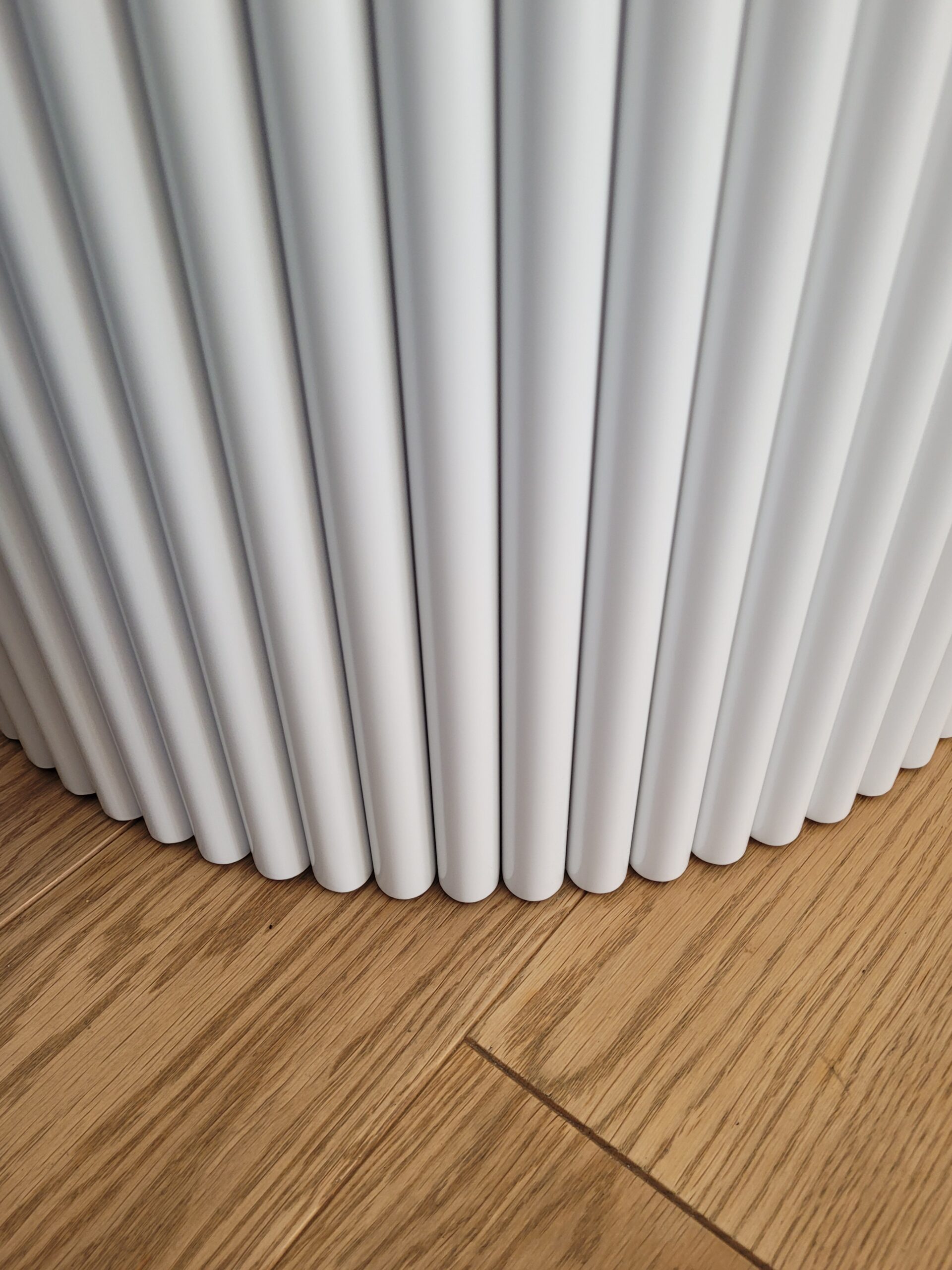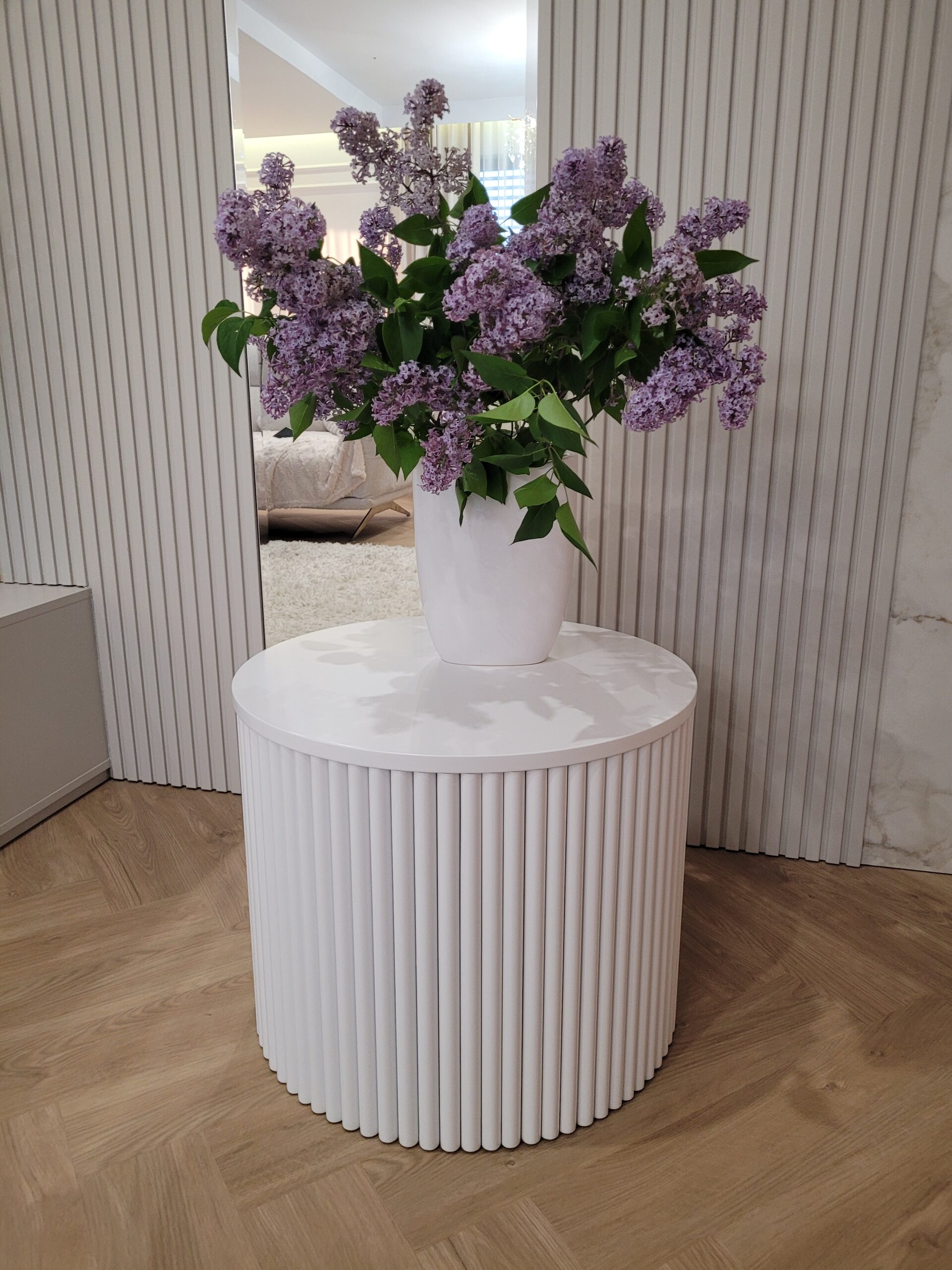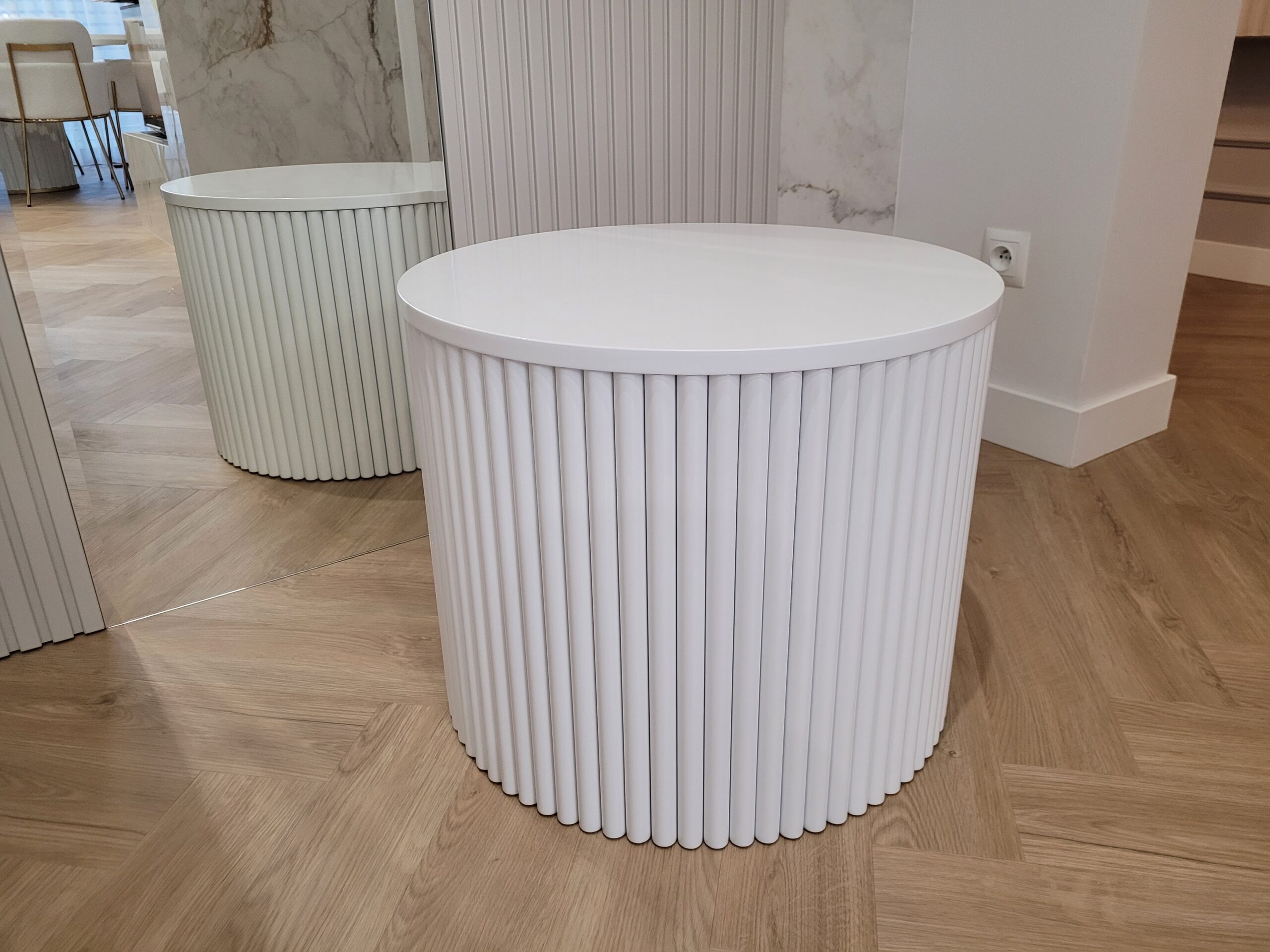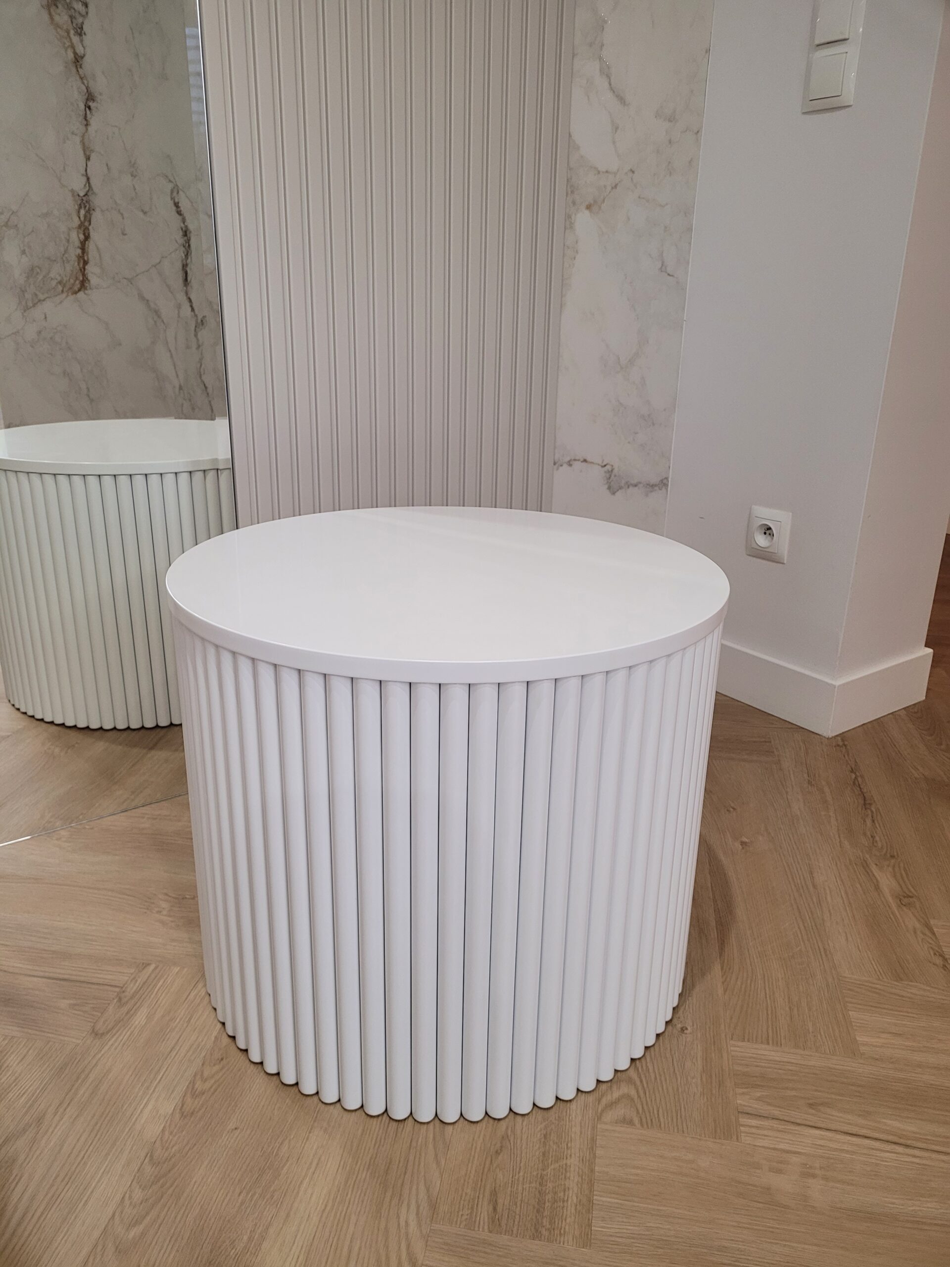 Stolik kawowy z lamelami – okrągły, biały, styl nowoczesny