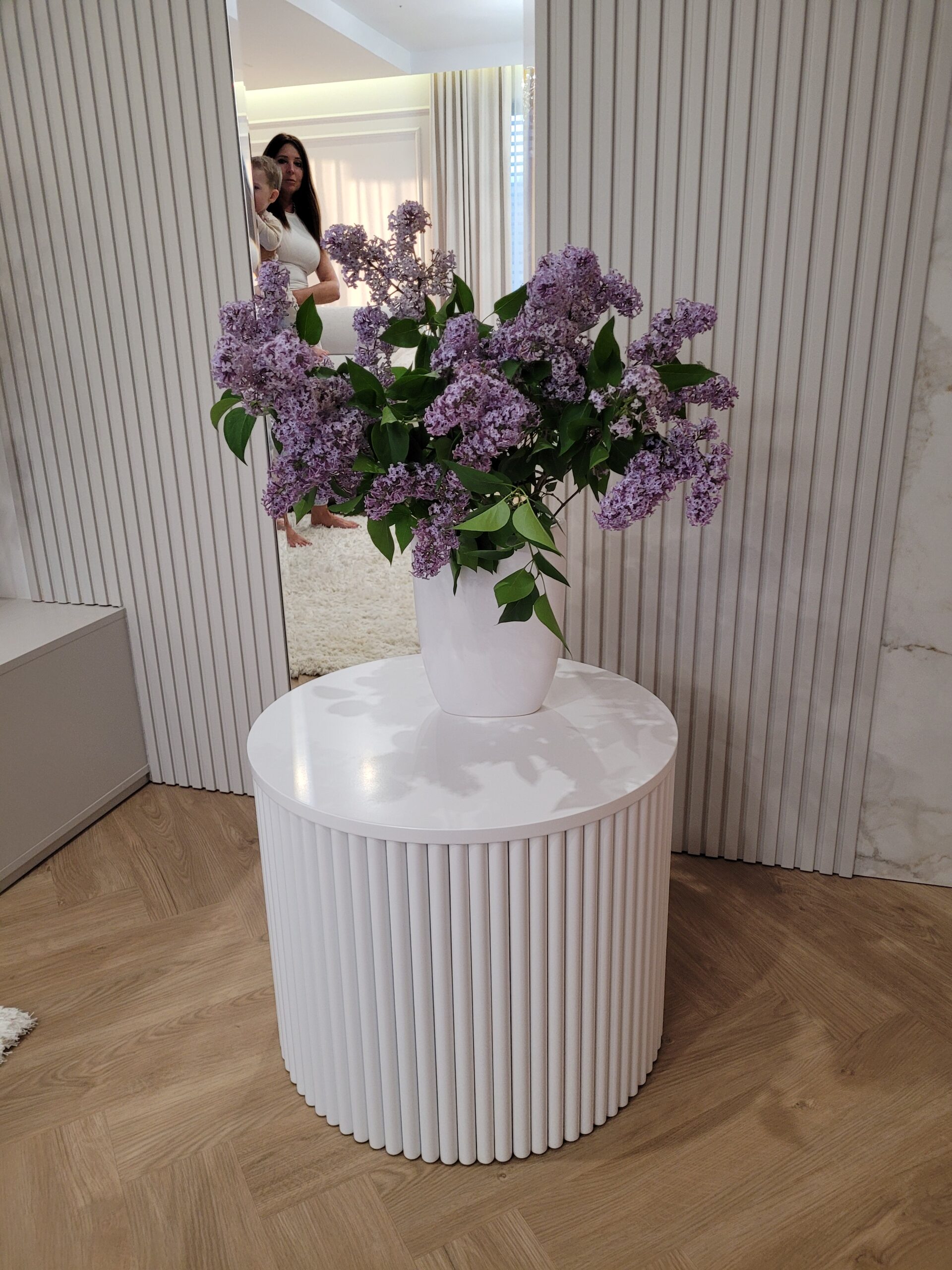 Pionowe lamele nadają bryle lekkości i rytmicznej elegancji. Okrągła forma sprawia, że stolik doskonale sprawdza się zarówno jako: